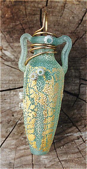 Material: LampWork Glass Bead by Kate Fowle, 14K Gold Can be strung on a cord or gold chain Height: 2 1/2 inches Width: 1 inch Depth: 1 inch |